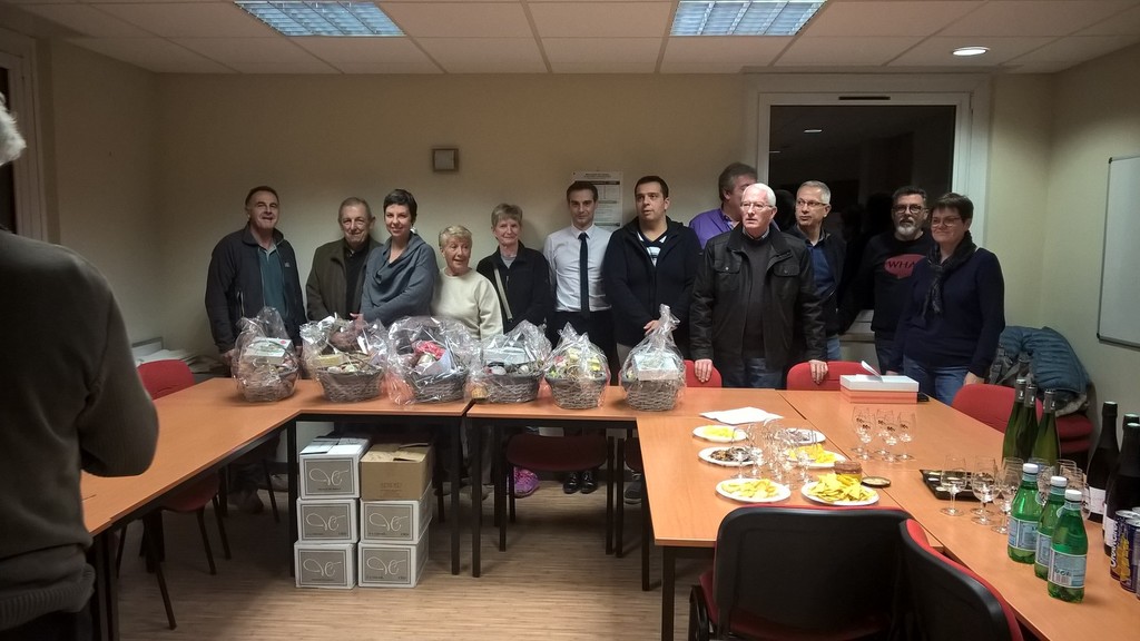 Après les brefs discours du président de l'USVG, PERREIN Hugues, et du directeur De l'agence de VIF du CA, Mr CLARINI Olivier, les 5 des 6 gagnants présents se virent remettre leurs paniers garnis de produits de bouches et un carton contenant un panachage de vins du Salon, et partagèrent ensuite le verre de l'amitié avec les dirigeants du Crédit Agricole et les bénévoles de l'USVG.